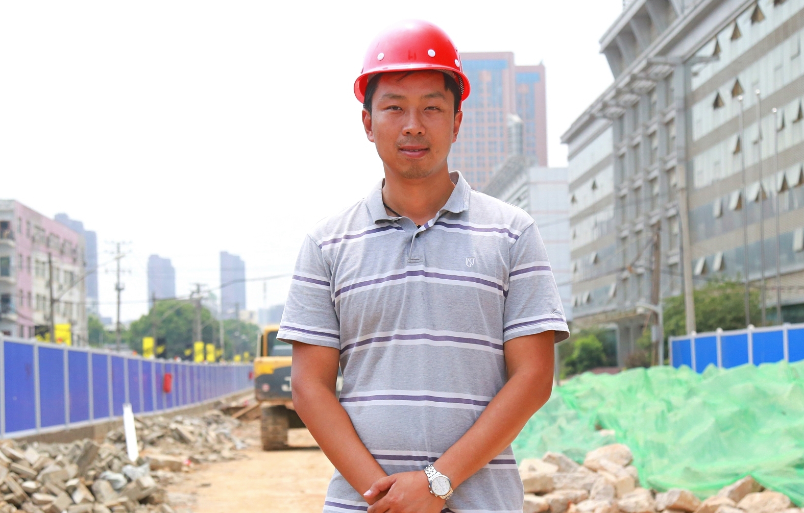 八月的隆祥街工地,正值搶抓工期的關(guān)鍵時(shí)期,施工現(xiàn)場如火如荼,呈現(xiàn)一派熱火朝天的繁忙景象。在眾多忙碌的身影中,一位皮膚黝黑、身高一米九的壯漢顯得格外醒目,他頭頂烈日,神情專注地在現(xiàn)場指揮若定。為確保隆祥街如期刷黑通車,他帶領(lǐng)項(xiàng)目部人員爭分奪秒,晝夜奮戰(zhàn),連續(xù)高強(qiáng)度作業(yè),從不言苦累。而眼前這種施工場景,正是他十幾年如一日的工作常態(tài)。他就是博宏建設(shè)的項(xiàng)目經(jīng)理——童威。