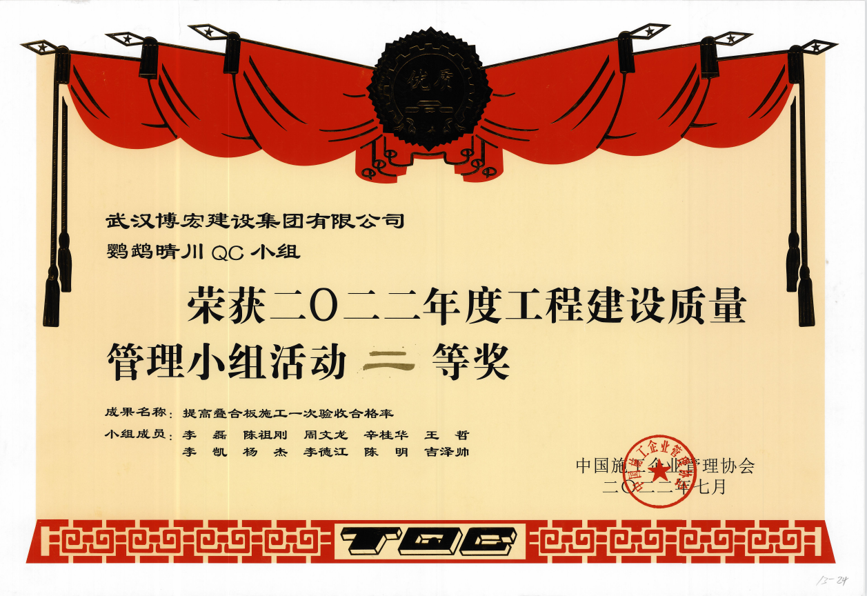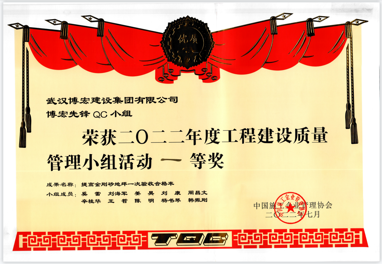 近日,由中國(guó)施工企業(yè)管理協(xié)會(huì)主辦的“2022年工程建設(shè)質(zhì)量管理小組競(jìng)賽活動(dòng)復(fù)賽和決賽”已圓滿結(jié)束,由我司報(bào)送的4項(xiàng)成果經(jīng)歷層層角逐,在全國(guó)1113個(gè)成果中脫穎而出。其中博宏先鋒QC小組的代表成果《提高金剛砂地坪一次驗(yàn)收合格率》榮獲一等獎(jiǎng)、芳草云天QC小組的代表成果《地下室外墻單側(cè)支模體系研制》與鸚鵡晴川QC小組的代表成果《提高疊合板施工一次驗(yàn)收合格率》榮獲二等獎(jiǎng)、博宏機(jī)電之星QC小組的代表成果《提高消防噴淋頭安裝定位準(zhǔn)確率》榮獲三等獎(jiǎng),博宏建設(shè)集團(tuán)QC成果再次取得重大突破!